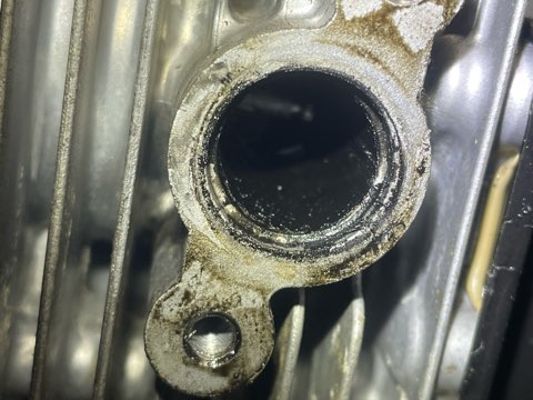 排気口から油分が出てガスケットとなる遮熱版を伝って下に垂れているという状況です。